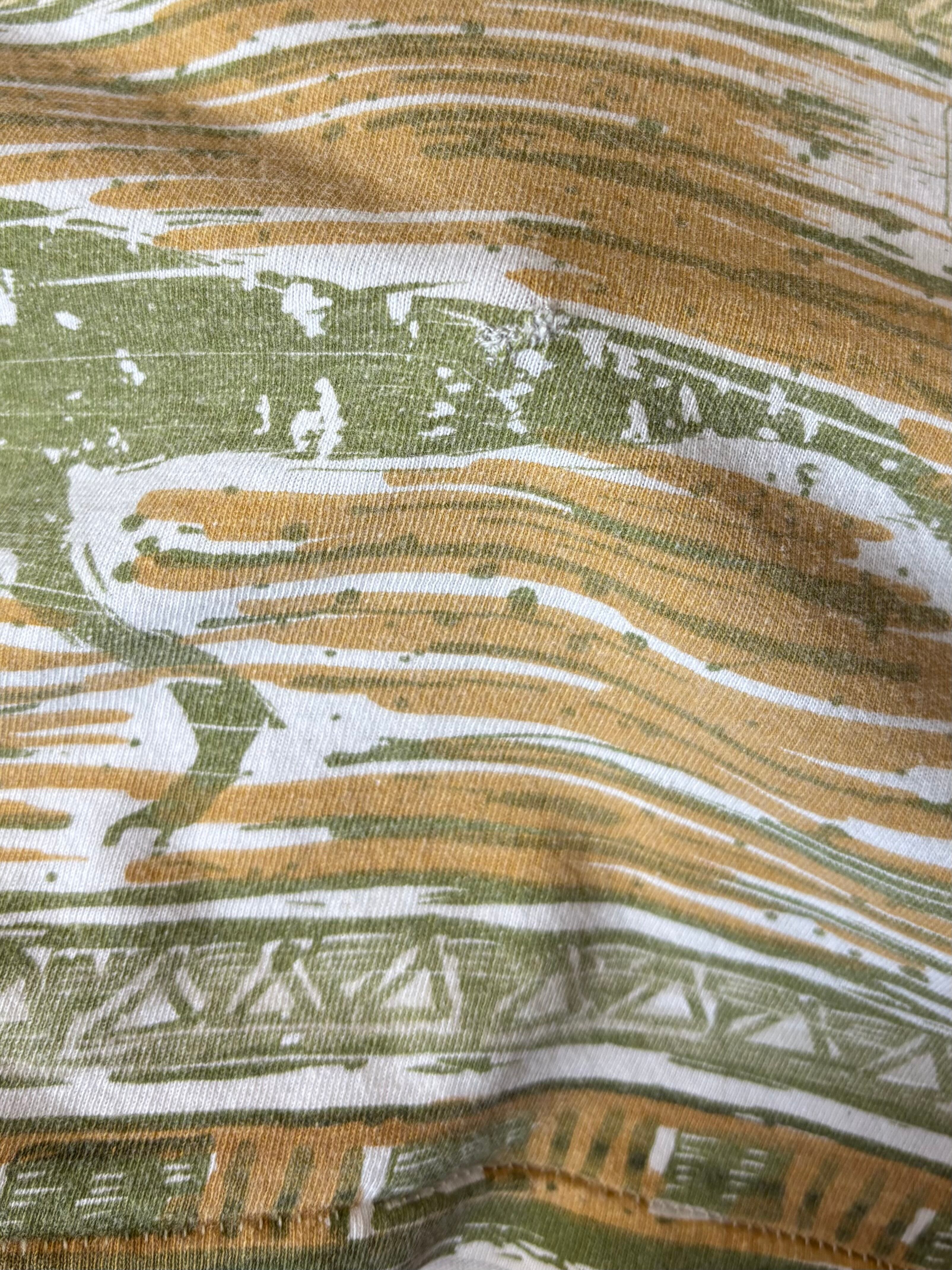 あまり見かけない総柄で、恐らくシルクスクリーンで刷られている為タグや内側へのインク飛びも僅かに見受けられます。